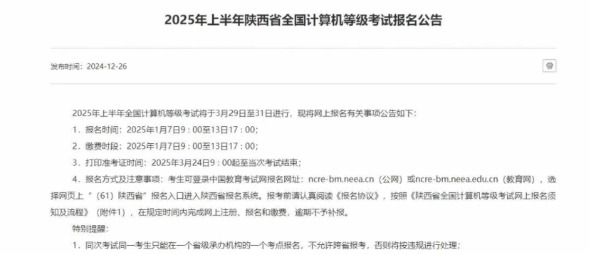 陕西省2025年上半年全国计算机等级考试(NCRE)报名公告