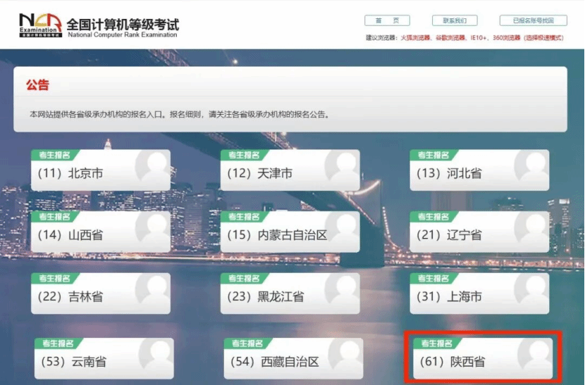 4.报名方式及注意事项:考生可登录中国教育考试网报名网址:ncre-bm.neea.cn(公网)或ncre-bm.neea.edu.cn(教育网),选择网页上“(61)陕西省”报名入口进入陕西省报名系统。