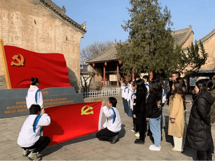 参观尾声,全体师生齐聚纪念馆广场,面对鲜红党旗庄严宣誓。“我志愿加入中国共产党……”铿锵誓言回荡在青砖灰瓦间。学院学工秘书吕邵绮老师表示:“重温誓词,是对初心的叩问,更是对使命的铭记。”