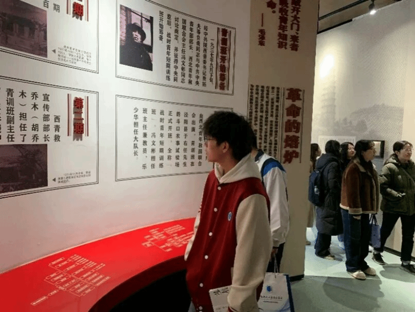 展厅内,师生们驻足凝视,或低声交流,或拍照记录。一幅描绘学员露天学习的油画前,解说员动情说道:“当年条件艰苦,但青年们信念如炬。这种精神正是新时代青年需要传承的。”积极分子代表学生李倩在笔记本上写道:“历史不是冰冷的文字,而是一代代人用生命铸就的信仰之路。”