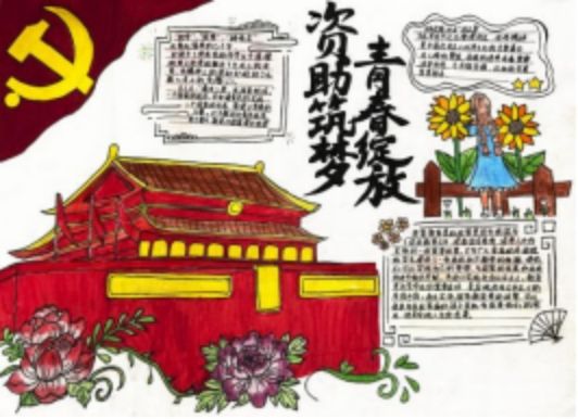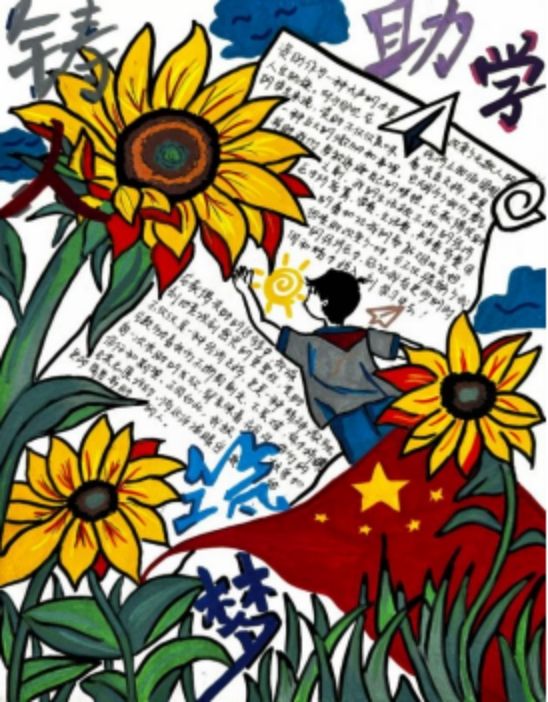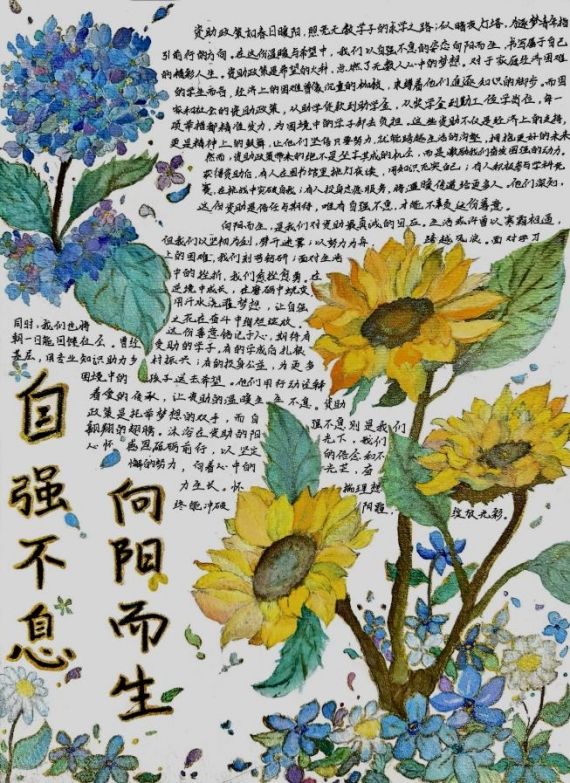 左佳阳同学的作品以向阳绽放的向日葵为主体,寓意受助学子在政策“阳光”下积极向上,构思巧妙,荣获一等奖。