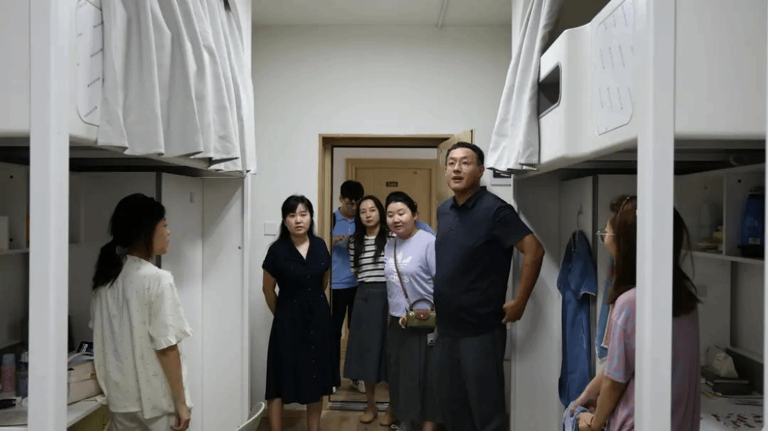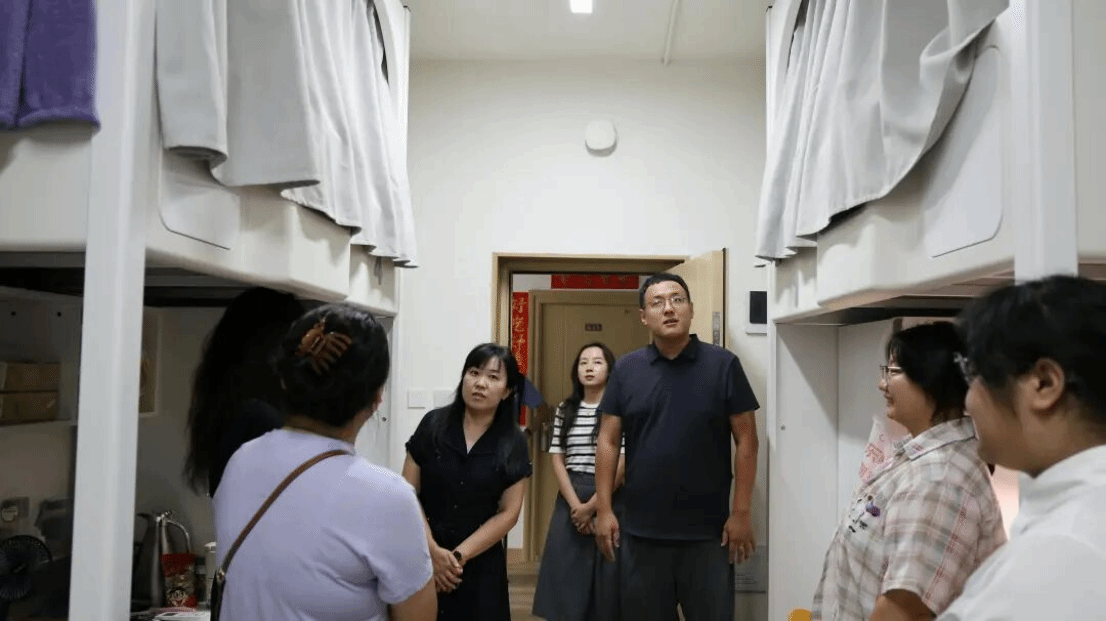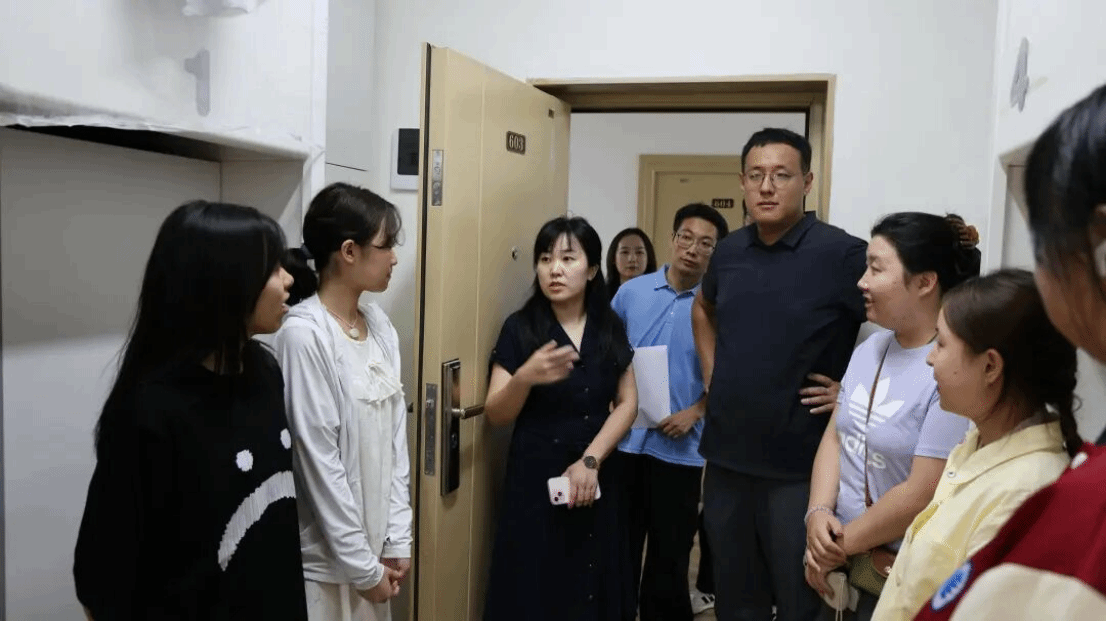 傍晚,院长翟思程、副院长唐晓冰率队走访2025级新生宿舍。老师们先送上问候:“孩子们,一路辛苦了。”院长翟思程耐心询问:“军训服合适吗?学校饭菜合口味吗?晚上空调温度够不够?”当听到有同学腼腆地说“还担心新环境睡不着”,“宿舍灯不亮、心里有小疙瘩,第一时间给辅导员发消息,我们随叫随到!”老师们笑着回答。随后,副院长唐晓冰又补充到“大学这四年,别怕慢,只怕停;只要你们肯迈出一步,学院的每一位老师都是你们随身的‘导航仪’,从专业难题到人生抉择,只要你们愿意开口,我们一定知无不言、言无不尽。”一句句鼓励像火把,点亮了新生眼中的星光。