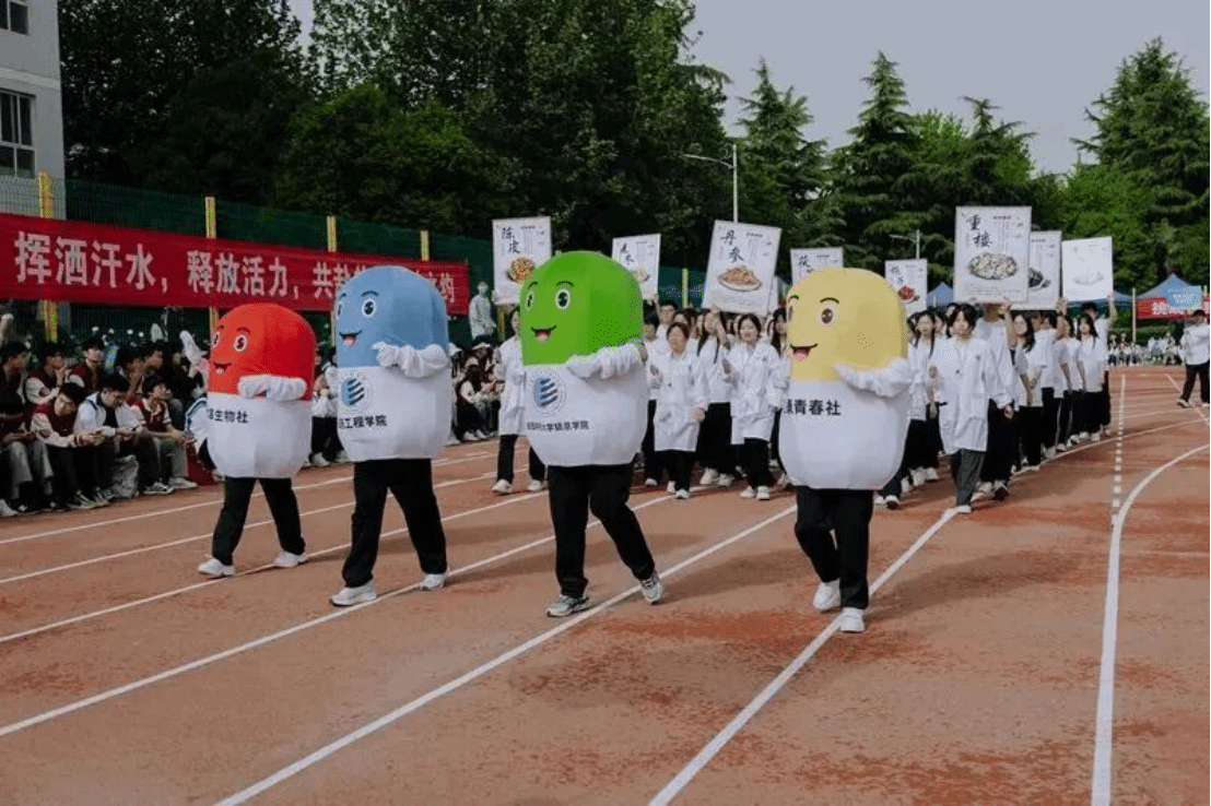 开幕式当天,朝阳初升,整个校园焕发出崭新的活力。各学院入场方阵依次登场,创意与特色兼具。我院方阵更是别具一格,四个可爱的卡通药丸形象走在前列,萌态尽显,瞬间吸引全场目光。紧跟其后的同学们,高举着精心制作的药材展示牌,步伐整齐划一,充分展现出专业特色与青春风貌,赢得现场阵阵喝彩。